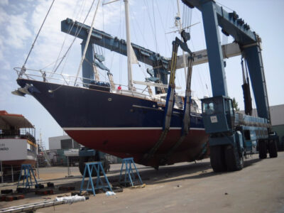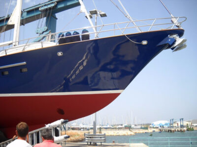 Matériau coque : Acier de 22 mm semelle de quille, 10 mm fond et 8 mm sur les bordées + renfort d’étrave
